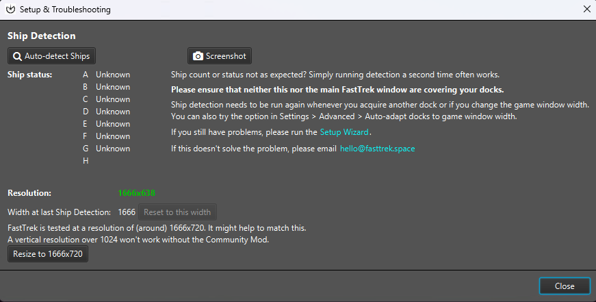 With the game running, launch FastTrek. The first time it starts, it will open the Setup and Troubleshooting wizard. The wizard runs through common initial configuration steps, such as making sure the game runs in windowed mode.